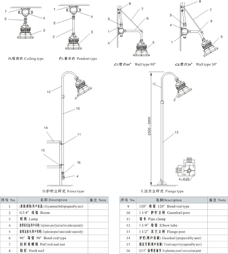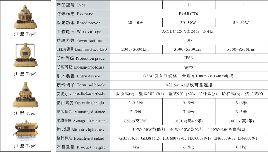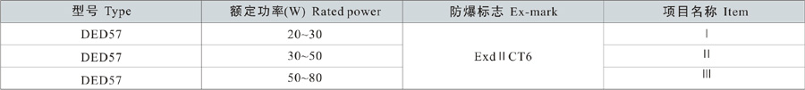 Note: 1. Select according to the product model description, pay attention to marking out the ex-mark; e.g.: Need product of 40W, 220V, pendant type, with junction box,gas explosion-proof, then the model should be DED57-40gH ExdIICT6 Gb;