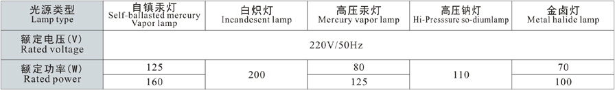 3、可配裝白熾燈、汞燈、高壓鈉燈、金鹵燈。