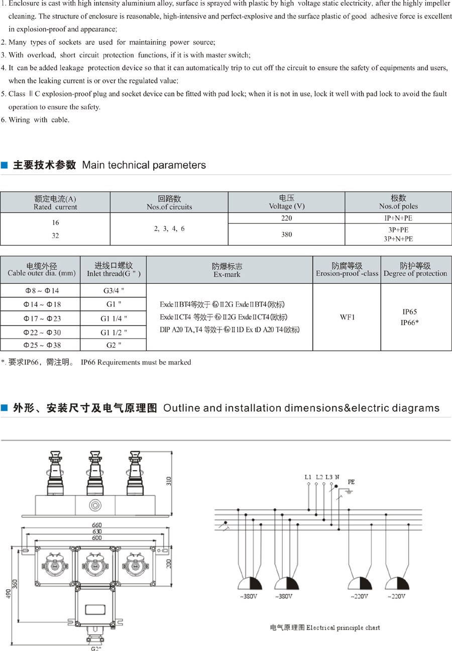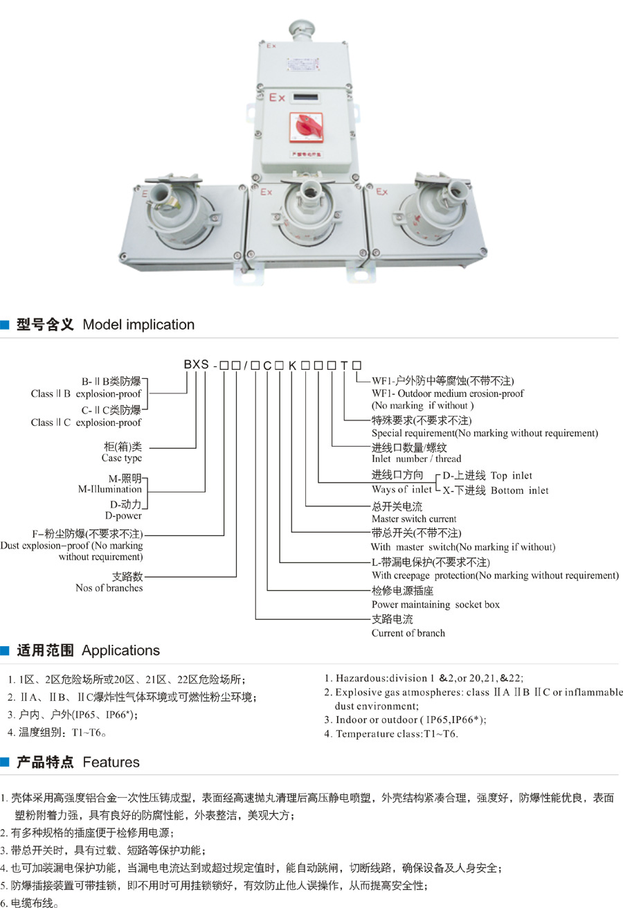 檢修電源插座箱—箱體采用鋁合金外殼壓鑄成型,表面噴塑,外形美觀;防爆照明(動力)配電箱—有多種規(guī)格的插座便于檢修用電源; 檢修電源插座箱—帶總開關(guān)時,具有過載、短路等保護功能; 防爆照明(動力)配電箱—也可加裝漏電保護功能,當(dāng)漏電電流達到或超過規(guī)定值時,能自動跳閘,切斷線路,確保設(shè)備及人身安全。">